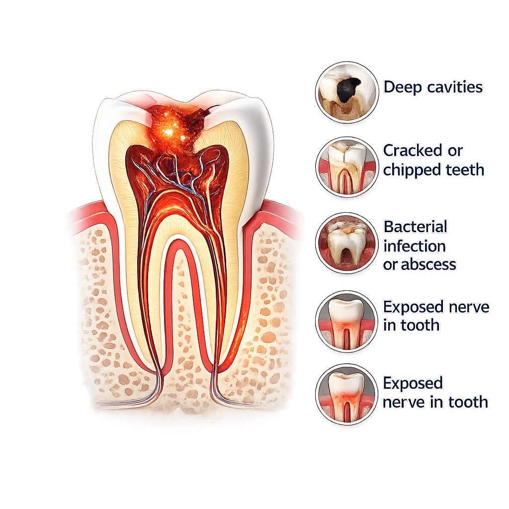 When tooth nerve pain is caused by infection or severe decay, the only reliable solution is professional dental treatment. The most common and effective procedure is a root canal, which removes the infected nerve safely.