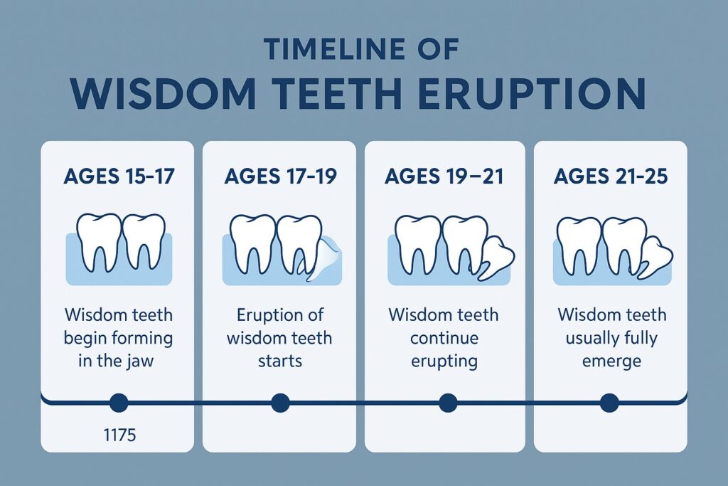According to the American Dental Association (ADA) and Dr. Angra’s clinical experience, wisdom teeth typically begin to erupt between ages 17 and 25. Here’s a general timeline: